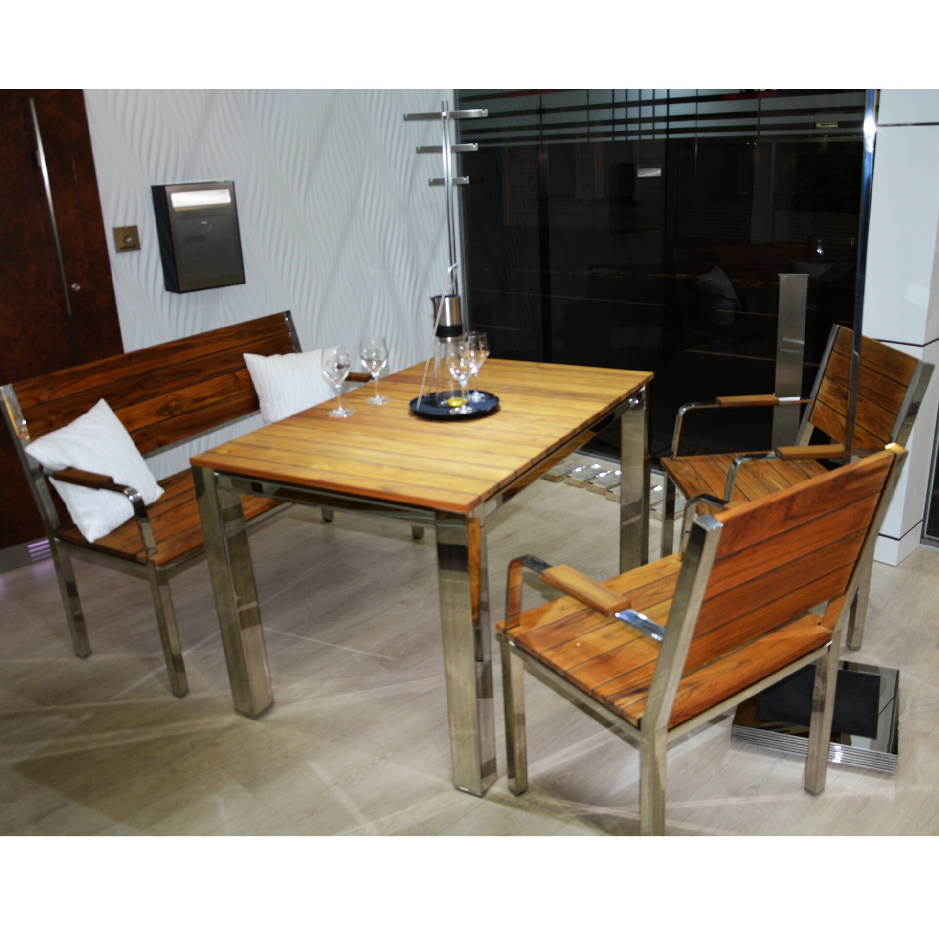 Sitzfläche Teakholz im Schiffbodendesign.